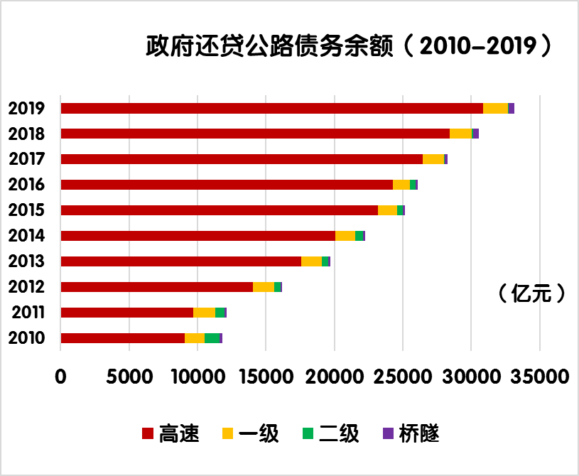 2019年度,全國(guó)經(jīng)營(yíng)性公路收支平衡結(jié)果為-2334.9億元。其中,經(jīng)營(yíng)性高速公路收支缺口2284.7億元,一級(jí)公路收支缺口53.1億元,二級(jí)公路收支缺口3.7億元,獨(dú)立橋梁及隧道收支盈余6.6億元。
