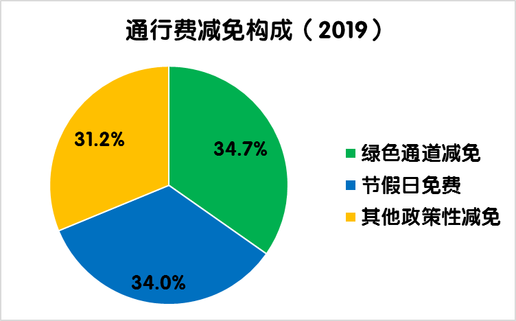 2019年度,全國(guó)收費(fèi)公路共減免車(chē)輛通行費(fèi)1009.7億元,占2019年度應(yīng)收通行費(fèi)總額的14.5%,比上年增加91.9億元,增長(zhǎng)10%。其中,鮮活農(nóng)產(chǎn)品運(yùn)輸“綠色通道”減免350.8億元,占全年通行費(fèi)減免總金額的比例為34.7%,比上年增加5.8億元,增長(zhǎng)1.7%;重大節(jié)假日免收小型客車(chē)通行費(fèi)343.7億元,占全年通行費(fèi)減免總金額的比例為34.0%,比上年增加35.7億元,增長(zhǎng)11.6%;高速公路差異化收費(fèi)、ETC通行費(fèi)優(yōu)惠、搶險(xiǎn)救災(zāi)車(chē)輛免費(fèi)等其他政策性減免315.3億元,占全年通行費(fèi)減免總金額的比例為31.2%。比上年增加50.4億元,增長(zhǎng)19%。