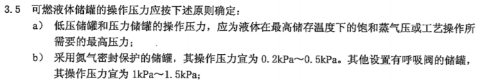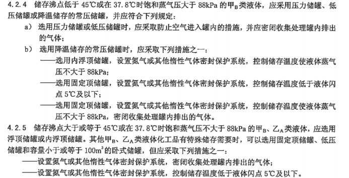 6.2.2條文解釋:對(duì)于有特殊要求的甲、乙液體物料,如苯乙烯、加氫原料、丙烯腈等易聚合、易氧化或有毒的液體物料,選用固定頂儲(chǔ)罐或臥式儲(chǔ)罐加氮封儲(chǔ)存也是可行的;