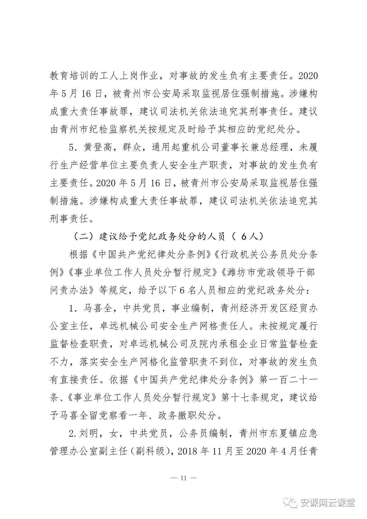 2020年5 月16 日,被青州市公安局采取監(jiān)視居住強制措施。涉嫌構(gòu)成重大責(zé)任事故罪,建議司法機關(guān)依法追究其刑事責(zé)任。建議由青州市紀檢監(jiān)察機關(guān)按規(guī)定及時給予其相應(yīng)的黨紀處分。