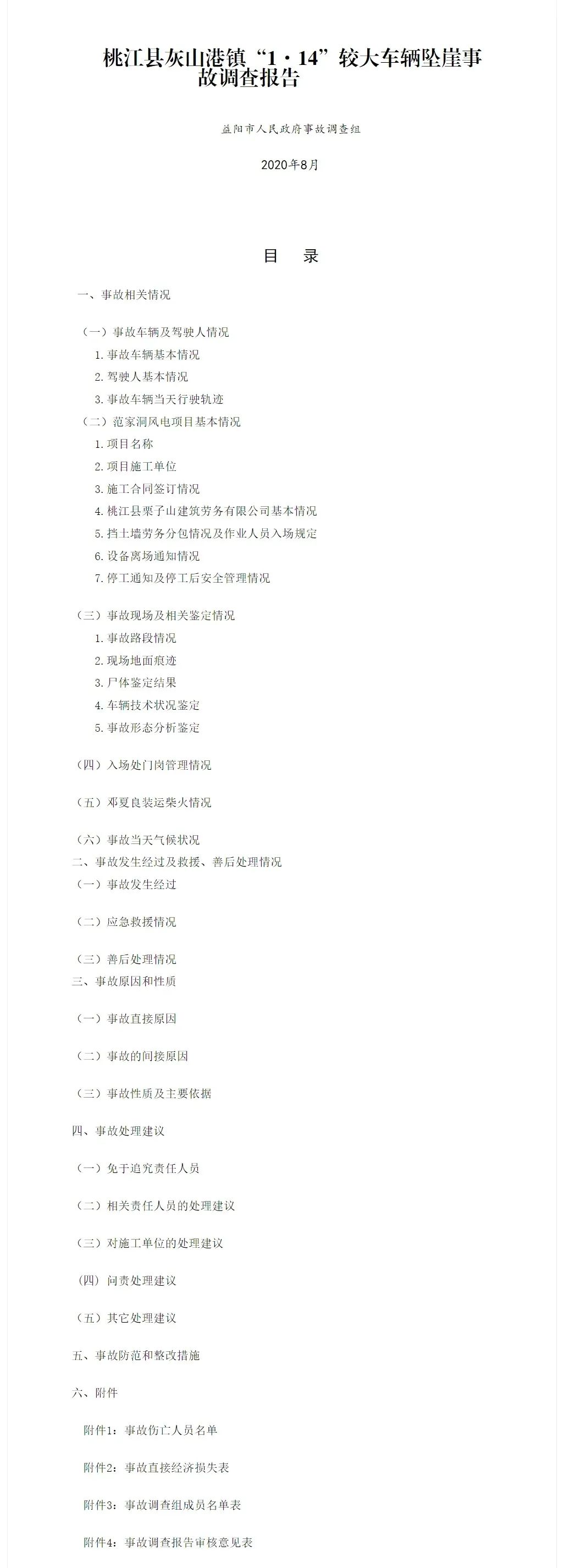 9月18日,湖南益陽(yáng)市應(yīng)急管理局發(fā)布桃江縣灰山港鎮(zhèn)“1·14”較大車輛墜崖事故調(diào)查報(bào)告。事故為2020年1月14日17時(shí)10分許,在桃江縣灰山港鎮(zhèn)范家洞風(fēng)電項(xiàng)目場(chǎng)內(nèi)道路5-1#主干道18#機(jī)位處發(fā)生一起車輛墜崖事故,導(dǎo)致5人死亡,車輛受損報(bào)廢,直接經(jīng)濟(jì)損失約528萬(wàn)元。報(bào)告原文如下: