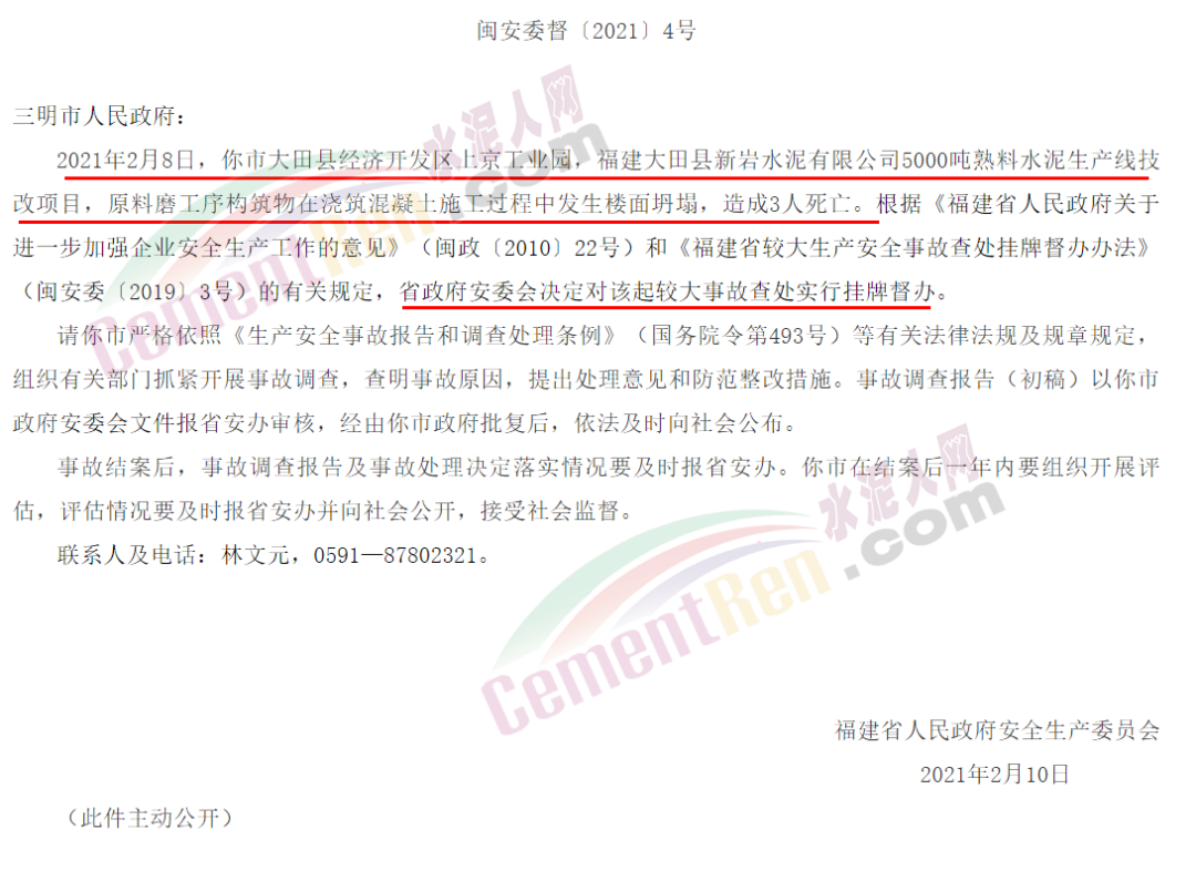 據(jù)水泥人網(wǎng)了解,福建省應急管理廳發(fā)布較大生產(chǎn)安全事故查處掛牌督辦通知書(三明大田2.8水泥技改項目施工過程樓面坍塌事故)稱,2021年2月8日,三明市大田縣經(jīng)濟開發(fā)區(qū)上京工業(yè)園,福建大田縣新巖水泥有限公司5000噸熟料水泥生產(chǎn)線技改項目,原料磨工序構(gòu)筑物在澆筑混凝土施工過程中發(fā)生樓面坍塌,造成3人死亡。 依據(jù)有關規(guī)定,福建省政府安委會決定對該起較大事故查處實行掛牌督辦。