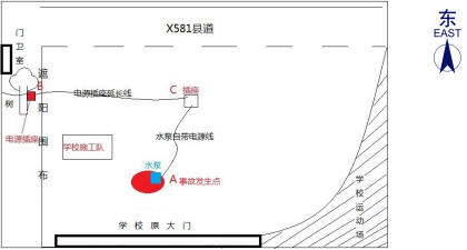 約9時,馮建威先到達現(xiàn)場查看情況,協(xié)調(diào)借用抽水泵和處理其他維修點工作。隨后,薛柏林、趙文輝駕駛工程車到達耕管村附近,將一些工具和材料送給附屬施工隊【1】后,約9時20分到達該爆水管處。兩人經(jīng)商量決定先抽走水坑里的水再檢查和維修水管。薛柏林駕駛工程車向附近(約500米外)作業(yè)的附屬施工隊借回一臺潛水泵(規(guī)格為3寸220V)和一根普通電源插座延長線,回來后將潛水泵放進水坑中。趙文輝和薛柏林向?qū)W校維修項目工地(靠學(xué)校操場跑道側(cè))借用臨時用電,將連接潛水泵的電源插座延長線插在工地施工用的排插上,啟動后發(fā)現(xiàn)潛水泵不運行,兩人徒手搖晃潛水泵并調(diào)整插頭,發(fā)現(xiàn)潛水泵仍不運行。經(jīng)詢問現(xiàn)場施工人員及剛好經(jīng)過的學(xué)校保安林建軍,得知樹下還有一處借電點,保安林建軍未經(jīng)請示校領(lǐng)導(dǎo)同意擅自協(xié)助兩人將電源插座延長線直接插到樹上排插上,此時潛水泵還是不運作,趙文輝和薛柏林懷疑潛水泵可能有故障或者是有雜物堵塞。約9時45分,趙文輝走向C處查看插頭是否松動時,薛柏林則用雙手徒手檢查潛水泵故障,不慎發(fā)生觸電。此時,馮建威已回來在一旁與上橫中心小學(xué)的張志老師交談,突然聽到薛柏林發(fā)出“觸電”的叫聲,隨即跌倒在地,雙腳落入水坑中。趙文輝立馬拔掉潛水泵自帶電源線的插頭,薛柏林掙扎爬到水坑邊臉朝下趴在地上,臉色發(fā)白,處于昏迷狀態(tài)。