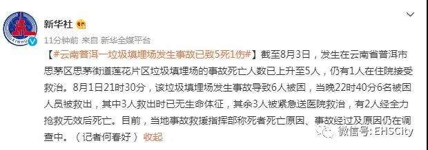 【#云南普洱一垃圾填埋場(chǎng)發(fā)生事故已致5死1傷#】截至8月3日,發(fā)生在云南省普洱市思茅區(qū)思茅街道蓮花片區(qū)垃圾填埋場(chǎng)的事故死亡人數(shù)已上升至5人,仍有1人在住院接受救治。8月1日21時(shí)30分,該垃圾填埋場(chǎng)發(fā)生事故導(dǎo)致6人被困,當(dāng)晚22時(shí)40分6名被困人員被救出,其中3人救出時(shí)已無生命體征,其余3人被緊急送醫(yī)院救治,有2人經(jīng)全力搶救無效后死亡。目前,當(dāng)?shù)厥鹿示仍笓]部稱死者死亡原因、事故經(jīng)過及原因仍在調(diào)查中。(記者何春好)極目新聞?dòng)浾呤崂戆l(fā)現(xiàn),普洱市中心城區(qū)生活垃圾焚燒發(fā)電廠建設(shè)項(xiàng)目,為思茅區(qū)2019年23項(xiàng)重點(diǎn)工作之一,于2019年啟動(dòng)建設(shè),并優(yōu)先完成填埋區(qū)建設(shè)。2020年,普洱市相關(guān)領(lǐng)導(dǎo)曾前往思茅區(qū),實(shí)地調(diào)研市中心城區(qū)生活垃圾焚燒發(fā)電廠項(xiàng)目推進(jìn)工作。公開資料顯示,2020年3月,配套填埋場(chǎng)正式投入使用,填埋場(chǎng)類型為填埋生活垃圾的衛(wèi)生填埋場(chǎng),庫容為30.1萬立方。