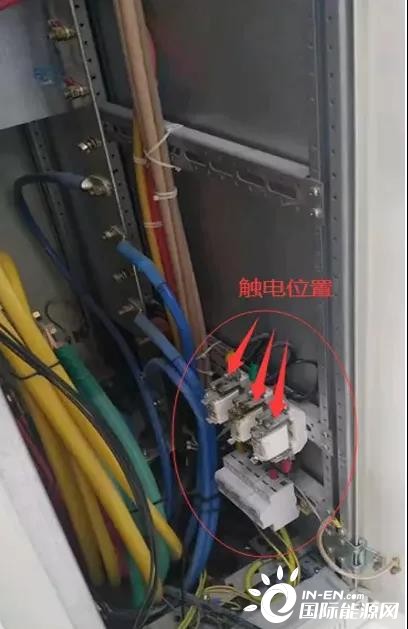 8月28日8點22分,王某帥(戴絕緣手套)完成本人負責的間隔電纜穿線并固定后,聽到隔壁柜發(fā)出聲響,檢查發(fā)現(xiàn)耿某坡(穿短袖上衣、未佩戴絕緣手套)身體倒進灰?guī)霢段MCC柜01間隔,右臂肘部及上臂與該柜浪涌保護熔斷式保險上插頭(裸露)三相搭接(現(xiàn)場照片見圖三)。王某帥立即通過拖拽耿某坡鞋子將其拉出間隔,并告知現(xiàn)場保安撥打120急救電話,同時進行不間斷心肺復蘇,通知本隊伍經理霍某平。