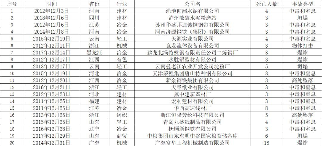2011年至2017年的12月份,工貿(mào)行業(yè)共發(fā)生較大及以上事故20起、死亡90人,中毒和窒息事故共11起、死亡41人,事故起數(shù)和死亡人數(shù)分別占55%和45%。其中2014年12月31日,廣東富華工程機(jī)械制造有限公司發(fā)生1起因爆炸,導(dǎo)致死亡18人的重大事故。